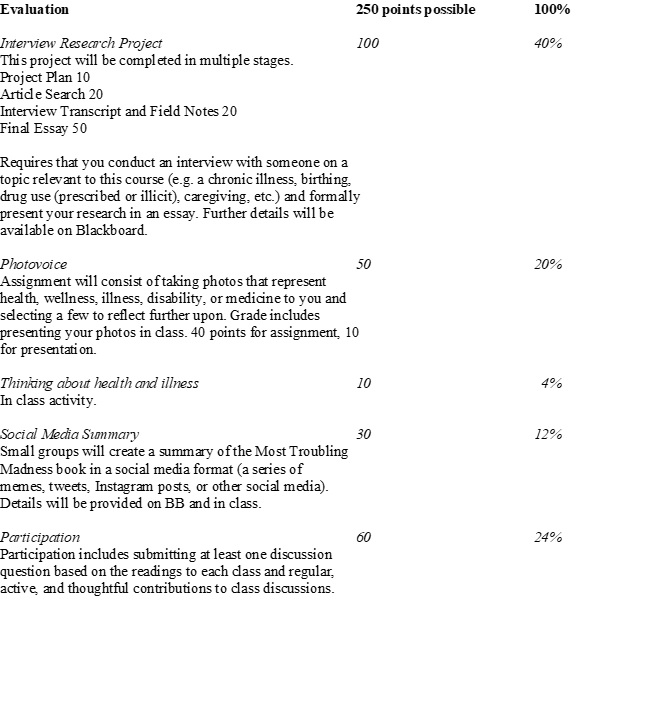 | 14 | 5/9 | Mental health around the world | T.M. Luhrmann (Editor), Jocelyn Marrow (Editor) Our Most Troubling Madness Conclusion In class social media summary group assignment. | |